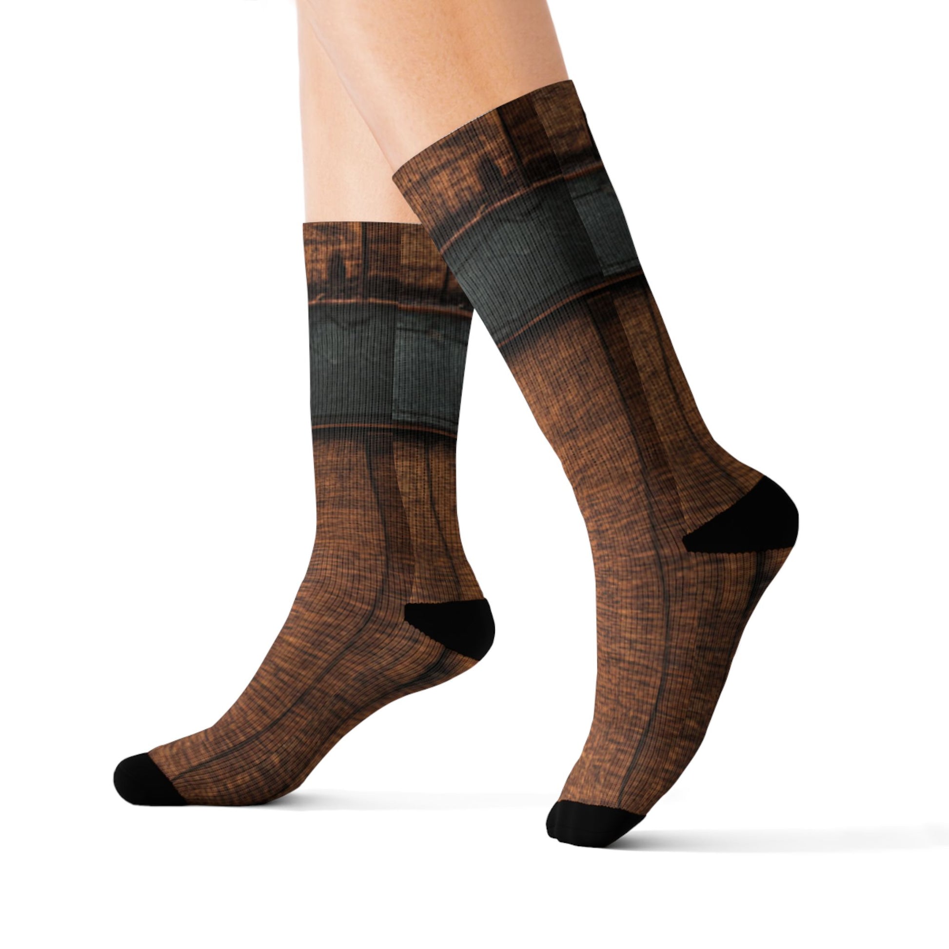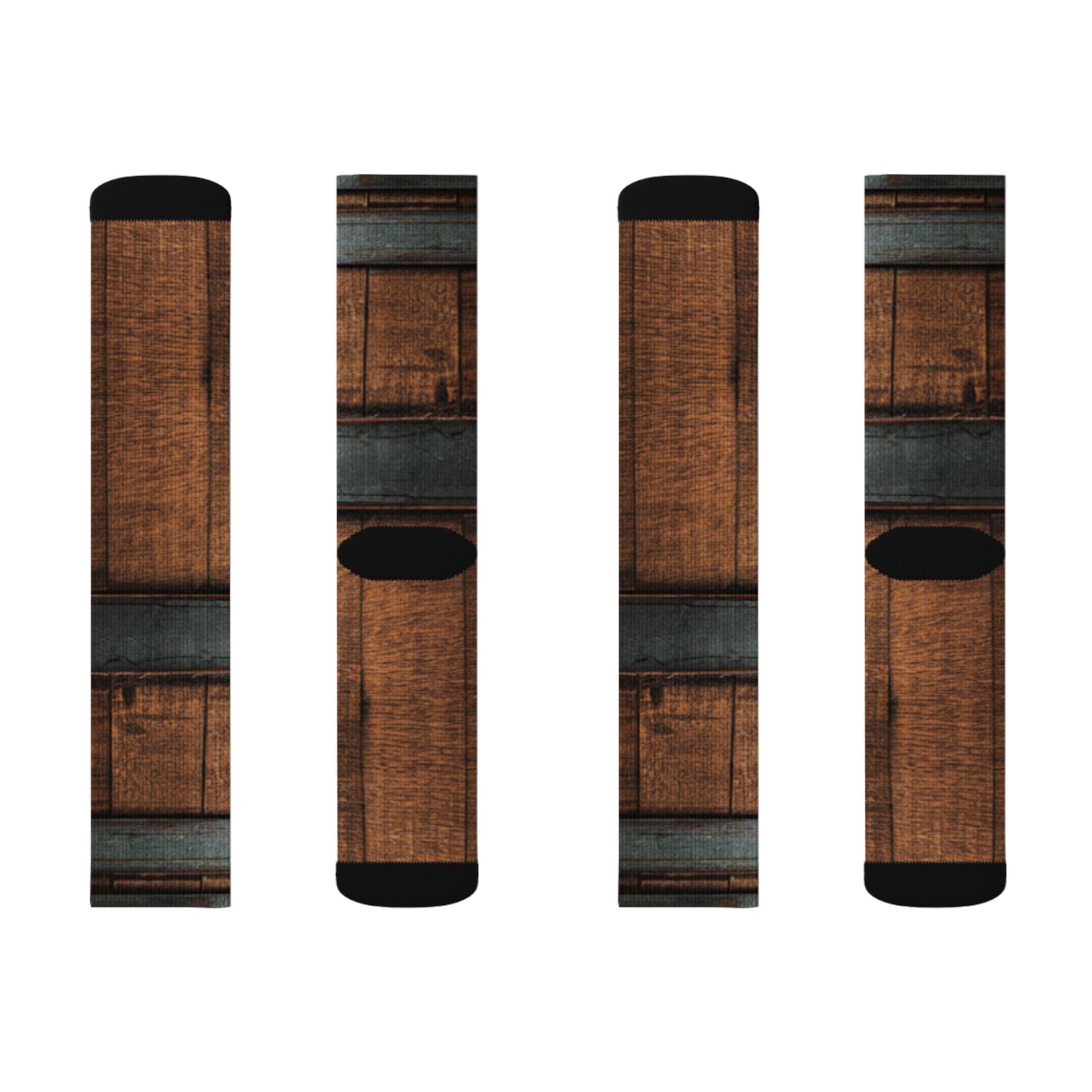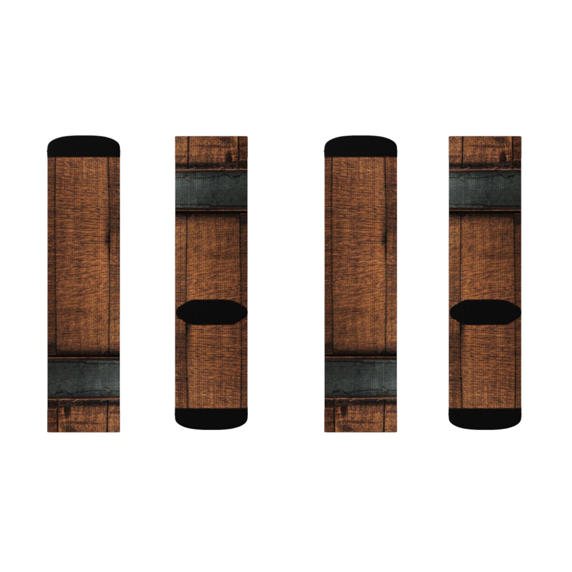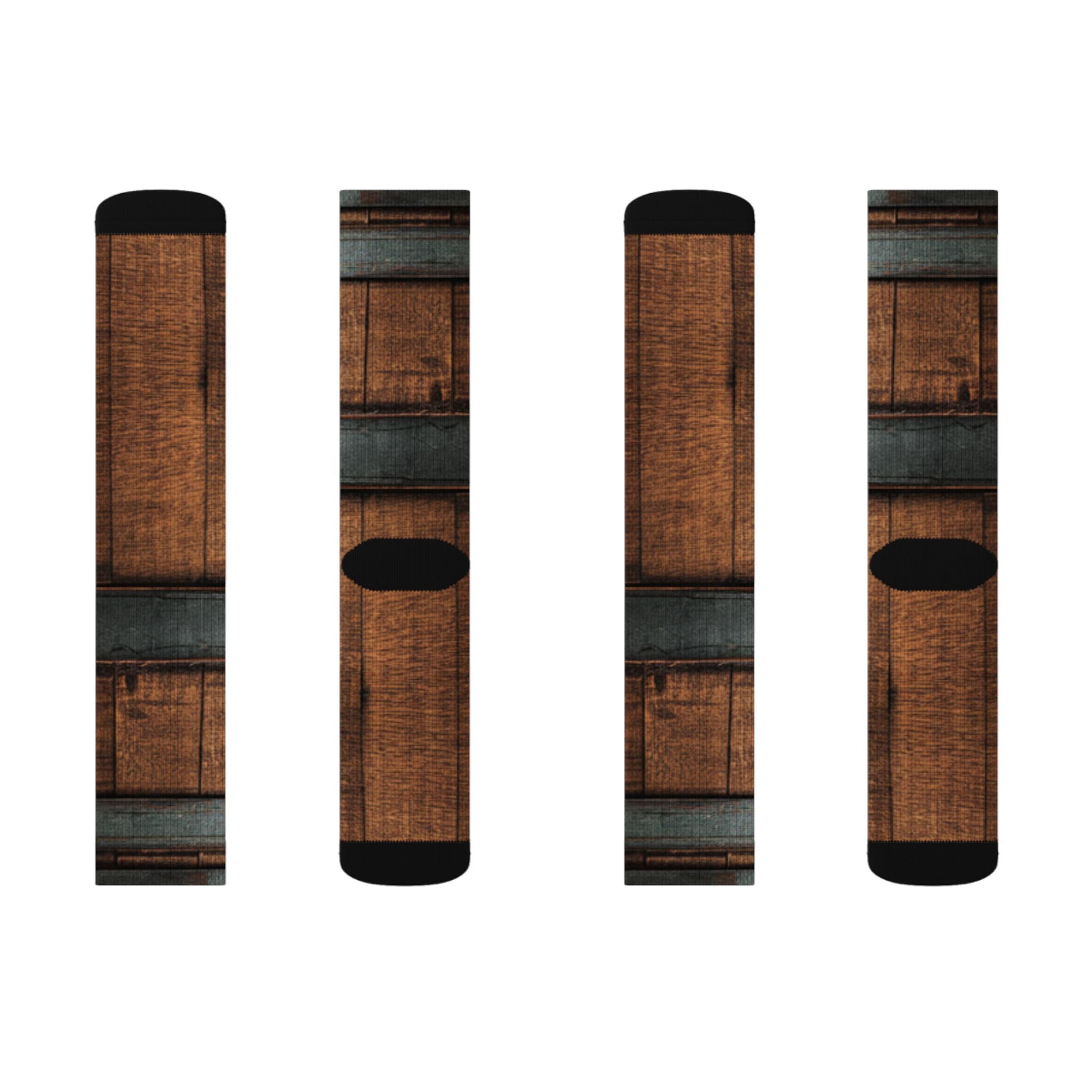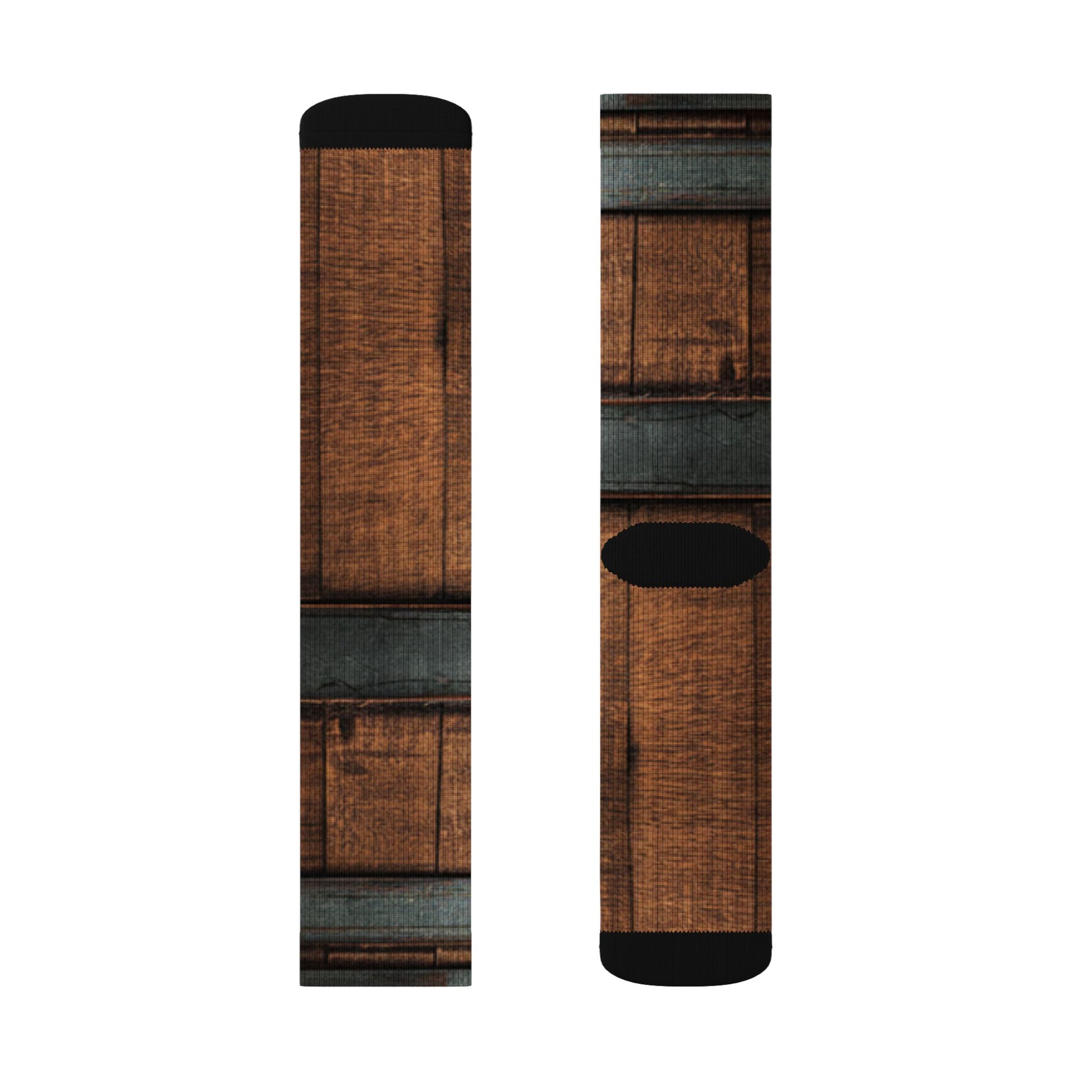 Cozy and quirky socks that resemble a whiskey barrel, perfect for whiskey enthusiasts and anyone looking to add a fun touch to their outfit.